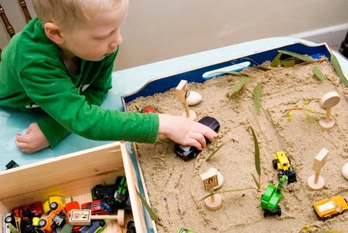 Sandtray therapy is a therapeutic approach that uses expressive, hands-on techniques. Client’s are encouraged to express themselves by creating a safe, imaginary world with a variety of figurines, toys and props utilizing sand. The scene created acts as a reflection of the child’s own life and allows them the opportunity to resolve conflicts, remove obstacles and gain acceptance of self. The sand is used as a tool for healing by increasing emotional expression while reducing psychological distress that can come from discussing traumatic events or experiences. Sand tray therapy is based on the notion that if a therapist provides the client with a safe space, the client will use the sand tray to create solutions to their problems on their own.
